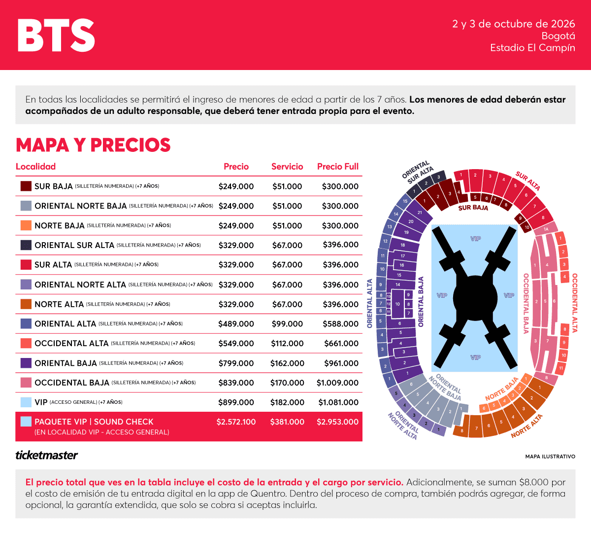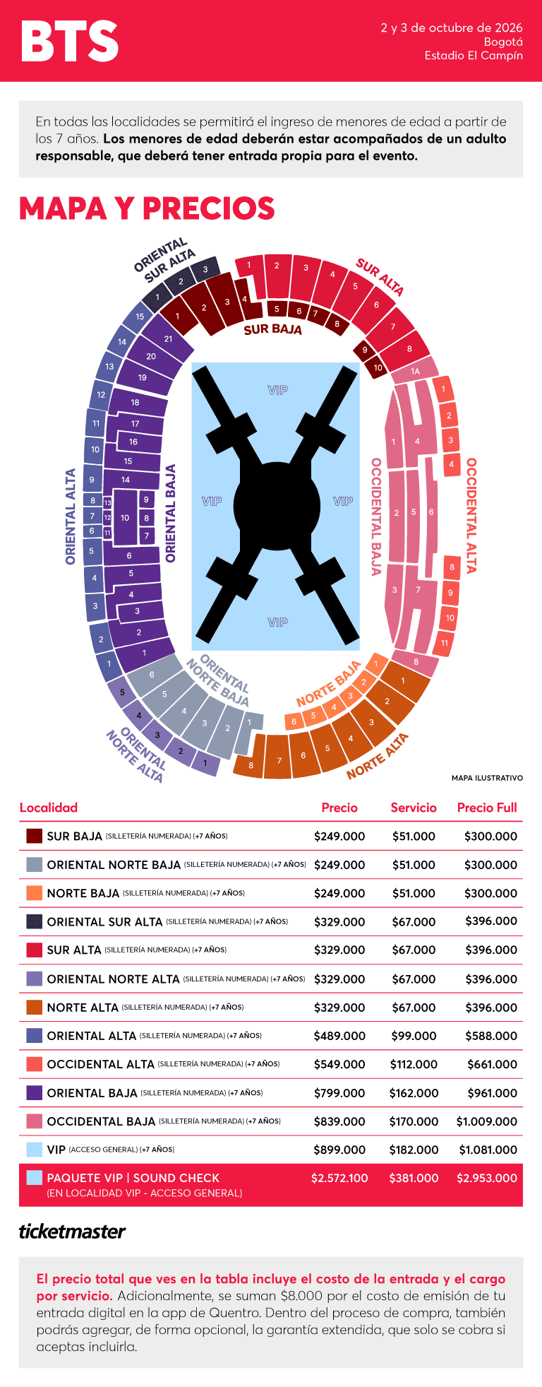 INGRESO PERMITIDO ÚNICAMENTE A MAYORES DE 7 AÑOS (EN ZONA PARA MENORES): En caso de no cumplir con el requisito mínimo de edad, NO se le permitirá el ingreso al evento NI se realizará devolución del dinero. Todos los menores entre 7 y 17 años deberán asistir acompañados por un adulto (+18), quien también deberá contar con una entrada individual. Los menores de edad solo podrán acceder a las localidades designadas para ellos, en estas zonas no se permitirá la venta de bebidas alcohólicas. Las localidades asignadas para menores serán: