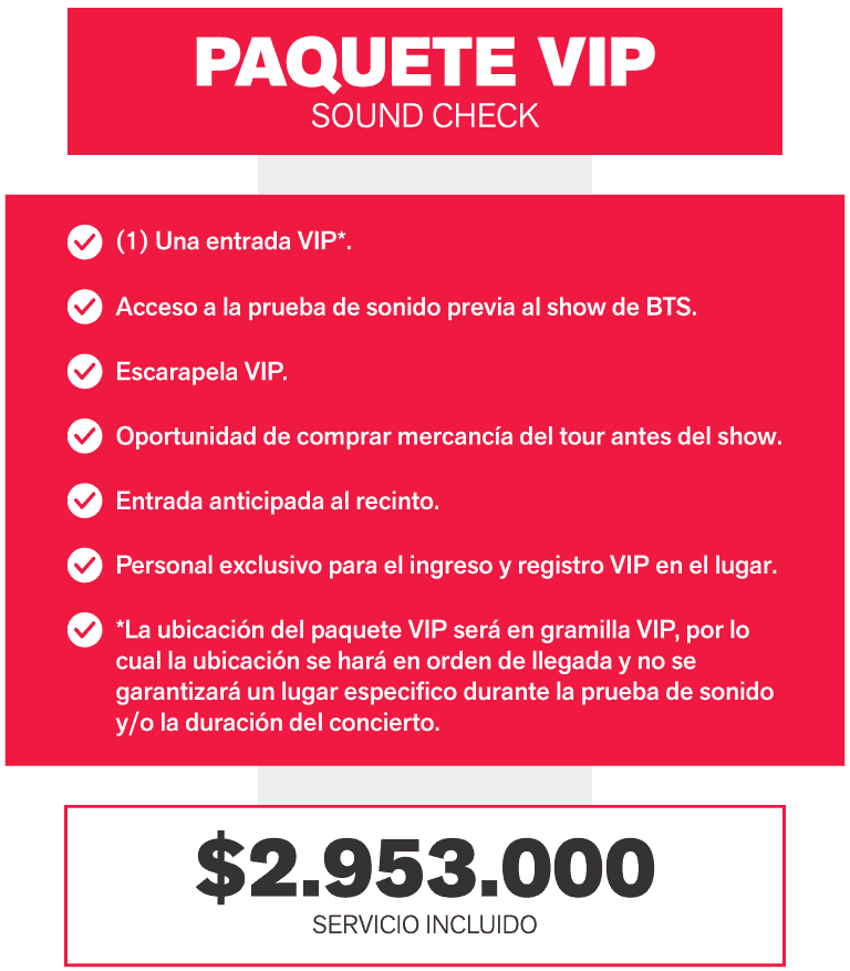 - Acceso a la prueba de sonido previa al show de BTS. Sujeto a condiciones del artista* (NO incluye Meet & Greet con el artista)