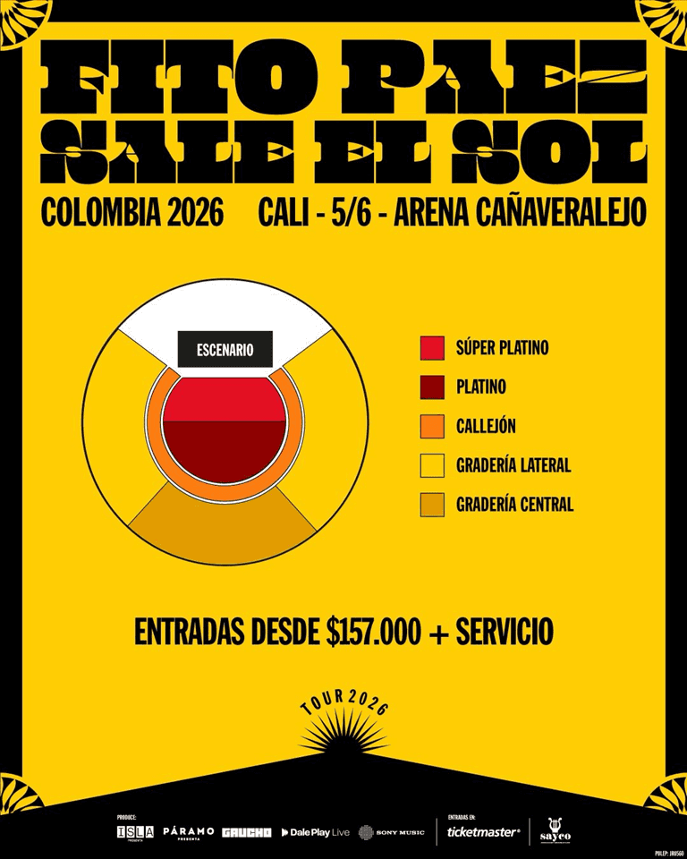 Fito Páez, uno de los grandes referentes del rock argentino, llega a Cali el 05 de junio con su gira Sale el Sol en la Arena Cañaveralejo. Tras su aclamada presentación en el Festival Cordillera en 2025, Fito llega con una propuesta renovada, acompañada de los clásicos de siempre. Con más de cuatro décadas de trayectoria y una carrera reconocida por la crítica y el público, Páez ofrecerá una noche intensa y emotiva, marcada por la sensibilidad, el talento y la historia que han definido al rock en América Latina.