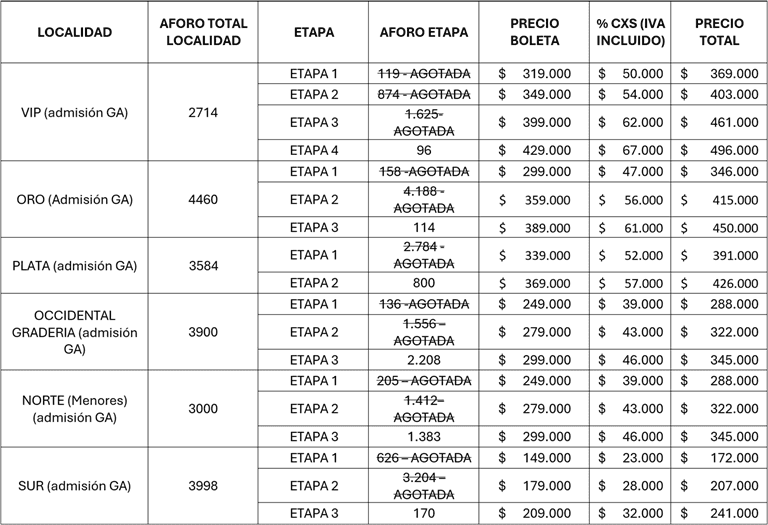 *Está incluido en el aforo total reservas técnicas, de organizador y de patrocinador que eventualmente pueden ser o no liberadas la venta. Dentro del aforo total, se incluyen las reservas efectuadas por el organizador de evento, en razón al cambio de venue (ver comunicado del organizador). ** La disponibilidad de boletería en cada ETAPA dependerá de las reservas efectuadas en los canales de Ticketmaster en cada una de las fases de salidas a venta. Una vez agotada una etapa, por adquisición y/o reservas, se habilitará la siguiente etapa, por lo cual no se podrán vender entradas de etapas anteriores. Toda reserva de una etapa agotada, que no se haga efectiva posteriormente, ya sea por devolución, retracto de compra, no pago, entre otros, pasará a hacer parte del aforo (entradas disponibles) de la etapa que se encuentre actualmente disponible.