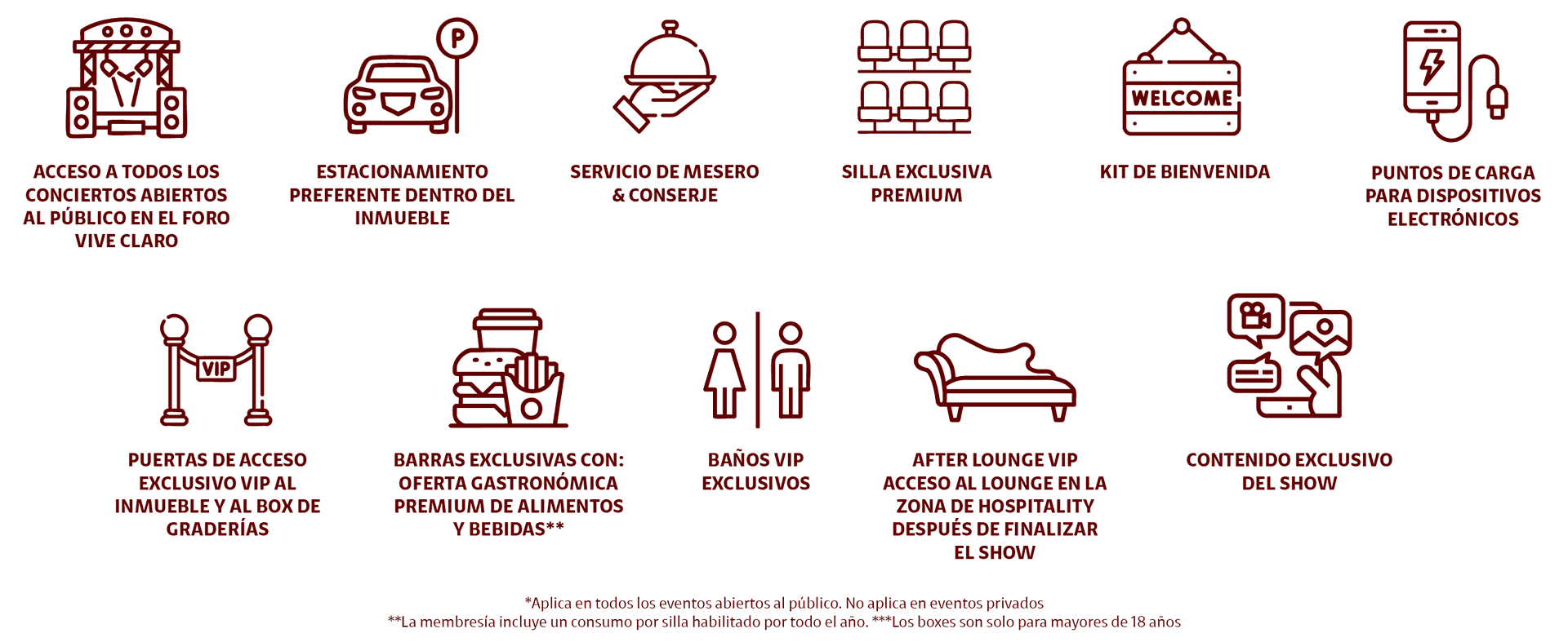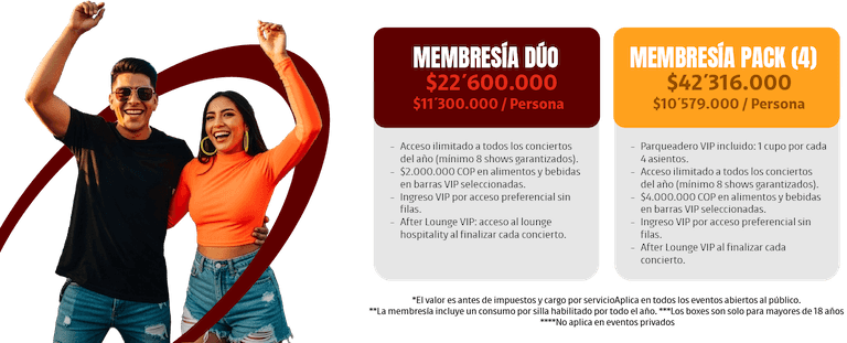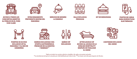 Una membresía premium para quienes entienden que un concierto no es solo el show, sino toda la experiencia. Con esta membresía accedes a todos los conciertos que se realicen en Vive Claro, desde un espacio con la mejor vista del venue, comidas y servicios exclusivos, trato preferencial y beneficios pensados para que cada noche sea impecable.